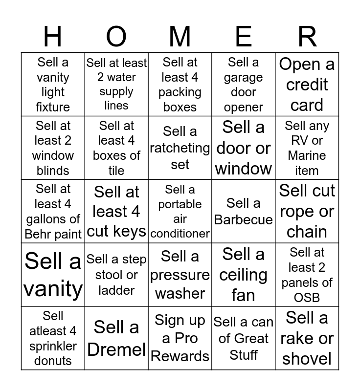 This bingo card has a free space and 24 words: Sell a step stool or ladder, Sell a Dremel, Sell a ratcheting set, Sell atleast 4 sprinkler donuts, Open a credit card, Sell a vanity light fixture, Sell at least 2 window blinds, Sell at least 2 water supply lines, Sell a Barbecue, Sell a pressure washer, Sell a door or window, Sell at least 4 gallons of Behr paint, Sell a ceiling fan, Sell at least 2 panels of OSB, Sell at least 4 boxes of tile, Sell a can of Great Stuff, Sell cut rope or chain, Sell at least 4 packing boxes, Sell any RV or Marine item, Sell at least 4 cut keys, Sell a rake or shovel, Sell a vanity, Sell a garage door opener and Sign up a Pro Rewards.