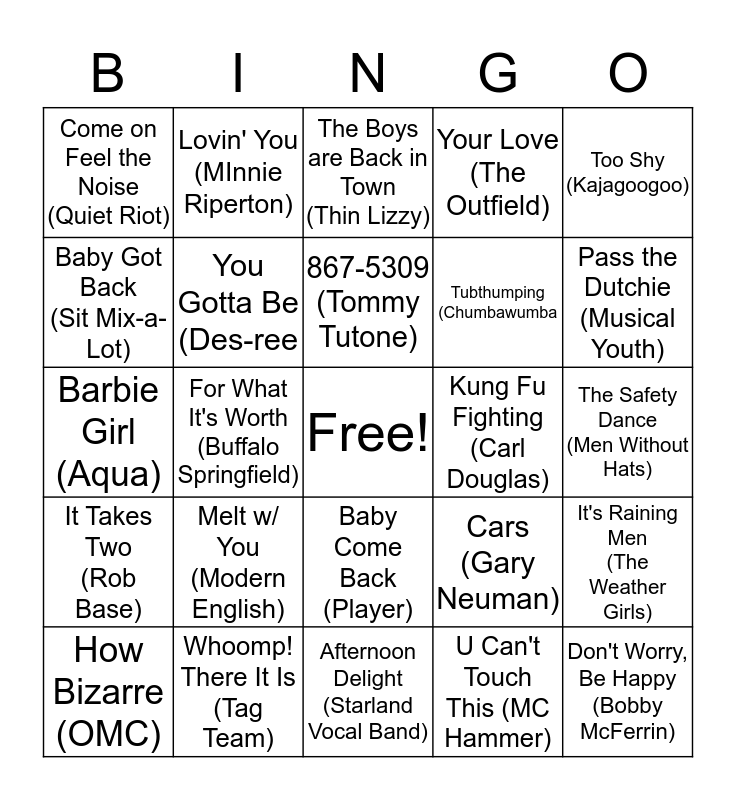 This bingo card has a free space and 24 words: Melt w/ You (Modern English), Whoomp! There It Is (Tag Team), 867-5309 (Tommy Tutone), How Bizarre (OMC), Too Shy (Kajagoogoo), Come on Feel the Noise (Quiet Riot), Baby Got Back (Sit Mix-a-Lot), Lovin' You (MInnie Riperton), Kung Fu Fighting (Carl Douglas), Baby Come Back (Player), Tubthumping (Chumbawumba, Barbie Girl (Aqua), Cars (Gary Neuman), It's Raining Men (The Weather Girls), You Gotta Be (Des-ree, U Can't Touch This (MC Hammer), The Safety Dance (Men Without Hats), The Boys are Back in Town (Thin Lizzy), Pass the Dutchie (Musical Youth), For What It's Worth (Buffalo Springfield), Don't Worry, Be Happy (Bobby McFerrin), It Takes Two (Rob Base), Your Love (The Outfield) and Afternoon Delight (Starland Vocal Band).