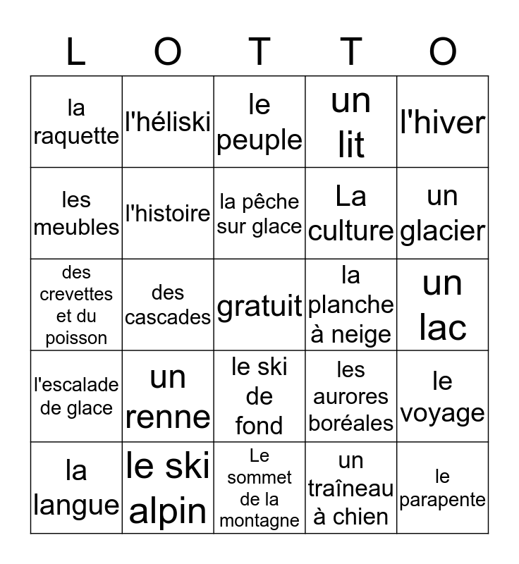 This bingo card has a free space and 24 words: un renne, le ski alpin, la pêche sur glace, la langue, l'hiver, la raquette, les meubles, l'héliski, la planche à neige, le ski de fond, La culture, des crevettes et du poisson, les aurores boréales, le voyage, l'histoire, un traîneau à chien, un lac, le peuple, un glacier, des cascades, le parapente, l'escalade de glace, un lit and Le sommet de la montagne.
