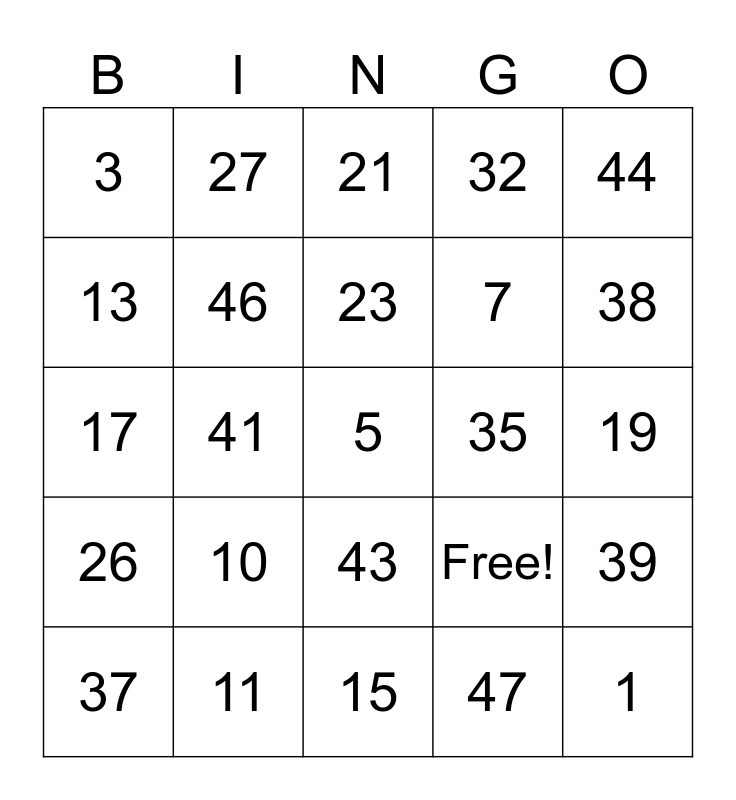 This bingo card has 25 words: 10, 15, 23, 37, 44, 3, 13, 27, 35, 43, 7, 17, Free!, 39, 46, 1, 19, 21, 38, 41, 5, 11, 26, 32 and 47.