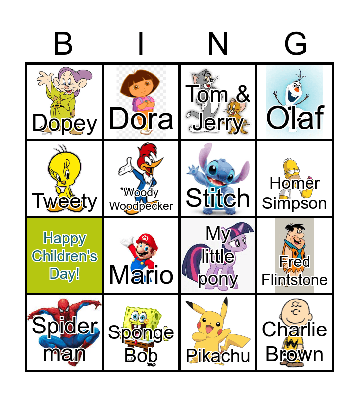 This bingo card has 28 images and 29 words: Bambi, Bugs Bunny, Casper, Charlie Brown, Dopey, Dora, My little pony, Fred Flintstone, Happy Children's Day!, Garfield, Hello Kitty, Homer Simpson, Mickey mouse, Ariel, Snow white, Batman, Spider man, Sponge Bob, Stitch, Olaf, Superman, Pink Panther, Pikachu, Tweety, Woody Woodpecker, Tom & Jerry, Blosoom, Mario and Bart Simpson.