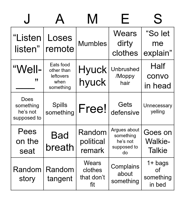 This bingo card has a free space and 24 words: Bad breath, Random tangent, Hyuck hyuck, Random story, “So let me explain”, “Listen listen”, “Well-___”, Loses remote, Gets defensive, Random political remark, Unbrushed /Moppy hair, Does something he’s not supposed to, Argues about something he’s not supposed to do, Goes on Walkie-Talkie, Eats food other than leftovers when something, Complains about something, Unnecessary yelling, Mumbles, Half convo in head, Spills something, 1+ bags of something in bed, Pees on the seat, Wears dirty clothes and Wears clothes that don’t fit.