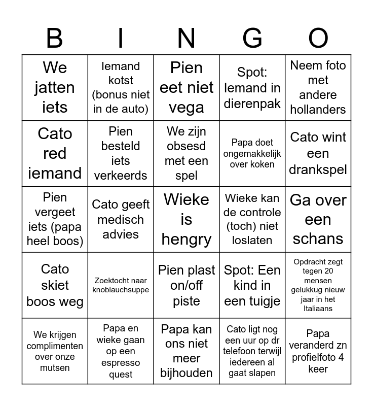 This bingo card has 65 words: Free!, Papa kruipt hard voor, We doen een nieuw jaars duik, Opdracht zegt tegen 20 mensen gelukkug nieuw jaar in het Italiaans, Er word op een avond meer dan 150 euro aan drank uitgegeven, Iemand heeft een kater, Iemand kotst (bonus niet in de auto), Wieke cato introduceedt studentending, We zijn obsesd met een spel, We slapen om 8 (tevroeg gepiekt), Pien plast on/off piste, Doe een adje met een vreemde, Ga over een schans, Neem foto met andere hollanders, Doe de habiba challenge, Cato red iemand, Cato geeft medisch advies, We jatten iets, Er word op iemand gehit, Papa doet ongemakkelijk over koken, Zoektocht naar knoblauchsuppe, Cato skiet boos weg, Spot: Iemand in dierenpak, Spot :Hond op de piste, Cato skiet zoals mama, Iemand leest een boek uit, Papa vergeet sourvernir voor miranda, Pien twijfelt veel te lang over iets kleine, Wieke is hengry, Papa praat gebrekkig duits tegen een italliaan, We krijgen complimenten over onze mutsen, Cato blokkeert de piste door haar gecarv, Spot: Een gele banaan (niet het fruit), Papa volgt wieke om te skiën, Spot: Een kind in een tuigje, Papa en wieke gaan op een espresso quest, Papa is aan het haasten in de ochtend, Pien vergeet iets (papa heel boos), Cato ligt nog een uur op dr telefoon terwijl iedereen al gaat slapen, Cato snapt met Ivan x20, Pien besteld iets verkeerds, Papa vind alles goed, Wieke kan de controle (toch) niet loslaten, Wieke word boos op papa omdat hij te veel vragen aan haar stelt, Papa vraagt dingen aan wieke terwijl het voor beiden een nieuwe situatie is, Wieke word gezien als papas vrouw, Cato wint een drankspel, Cato is eerder op dan wieke, Papa veranderd zn profielfoto 4 keer, Papa word (dronken) emotioneel, Papa zegt wat hebben we t toch goed, Cato is tappie na 1,5 drankje, Iemand skiet een kind aan, Papa kan ons niet meer bijhouden, We drinken rum choco, Wieke en pien hebben ruzie om de verdeling van iets (ei), Cato wordt boos om skieschoenen, Pien eet niet vega, Pien neemt de verkeerde afslag, Cato huilt op de piste, Pien valt, Cato valt, Wieke valt, Papa valt and Cato “leert”.