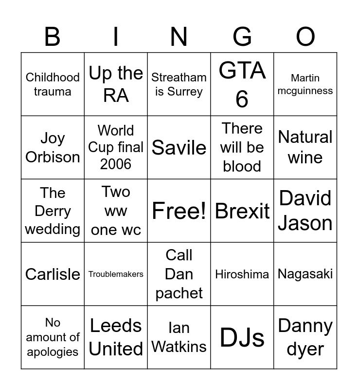 This bingo card has a free space and 25 words: Troublemakers, Ian Watkins, Savile, No amount of apologies, Martin mcguinness, Childhood trauma, Joy Orbison, Up the RA, Brexit, Call Dan pachet, There will be blood, The Derry wedding, Hiroshima, Nagasaki, World Cup final 2006, Oi oi oi, David Jason, Streatham is Surrey, Natural wine, Two ww one wc, Danny dyer, Leeds United, Carlisle, GTA 6 and DJs.