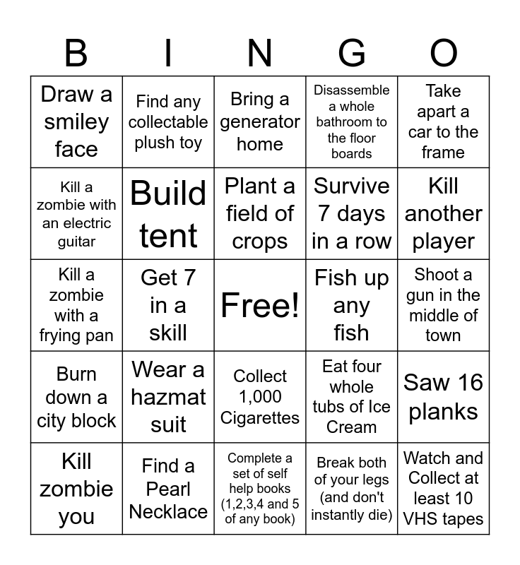 This bingo card has a free space and 56 words: Visit a spiffo's, Kill zombie you, Heal from a sickness or injury, Draw a smiley face, Complete a set of self help books (1,2,3,4 and 5 of any book), Have 7 radios at once, Build tent, Get a rifle, Survive 7 days in a row, Drive for at least 60 seconds, Disassemble a whole bathroom to the floor boards, Get a non stone axe, Collect 50 pairs of socks, Wear a full military outfit (Gas mask, shirt, paints, boots, jacket, helmet), Get maps (March Ridge, Muldraugh, Riverside, Rosewood, West Point), Collect a Lawn Gnome, Take apart a car to the frame, Get 7 in a skill, Get a sledgehammer, Watch and Collect at least 10 VHS tapes, Fish up any fish, Wear aviators, Eat four whole tubs of Ice Cream, Bring a generator home, Find Night Vision Goggles, Plant a field of crops, Kill 100 Zombies, Make contact with another player, Kill another player, Catch any wild animal, Cook a dish worth at least 60 hunger, Find a backpack (Any container you can put on your back), Find a Katana, Craft a spear tipped with an object, Shoot a gun in the middle of town, Kill a zombie with an electric guitar, Kill a zombie with a frying pan, Make a Moltov Cocktail, Burn down a city block, Find any collectable plush toy, Collect 1,000 Cigarettes, Collect 50 watches, Find playing cards, poker chips or game pieces, Get all skills to at least level 1, Wear a prisoner jumpsuit, Wear a hazmat suit, Find a Pearl Necklace, Wear a Santa Hat and suit, Wear the Spiffo Suit (Body, head and tail), Fill a toolbox with medical supplies (At least 8.5 weight), Break both of your legs (and don't instantly die), Destroy a car, Collect 30 basic books (Not skill books, but the stress relieving untitled books), Bundle chopped logs, Saw 16 planks and Build a book case.