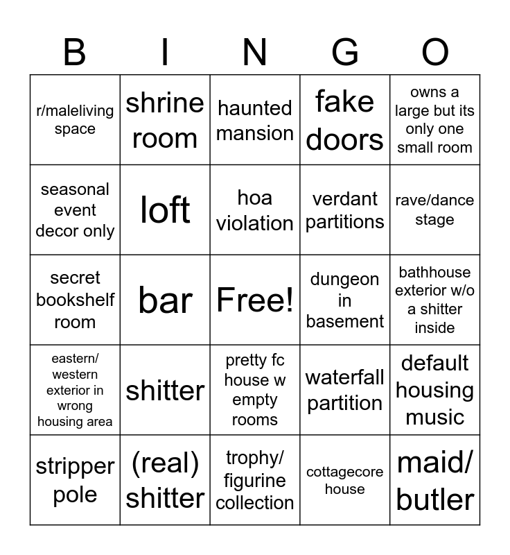 This bingo card has a free space and 24 words: shitter, (real) shitter, hoa violation, stripper pole, owns a large but its only one small room, r/maleliving space, seasonal event decor only, shrine room, dungeon in basement, pretty fc house w empty rooms, verdant partitions, secret bookshelf room, waterfall partition, default housing music, loft, cottagecore house, bathhouse exterior w/o a shitter inside, haunted mansion, rave/dance stage, bar, maid/ butler, eastern/ western exterior in wrong housing area, fake doors and trophy/ figurine collection.