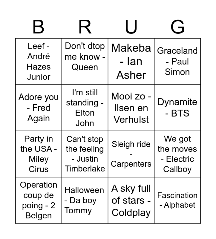 This bingo card has 27 words: Waterval - K3, Total eclipse of the heart - Bonnie Tyler, Party in the USA - Miley Cirus, Engelbewaarder - Marco Schuitmaker, I'm still standing - Elton John, Makeba - Ian Asher, Don't dtop me know - Queen, Fascination - Alphabet, Halloween - Da boy Tommy, Sweet put psycho - Ava Max, Sleigh ride - Carpenters, Graceland - Paul Simon, Tarzan boy - Baltimora, Firework - Kate Perry, Can't stop the feeling - Justin Timberlake, My first my last my everything - Barry White, Mooi zo - Ilsen en Verhulst, Dynamite - BTS, Erop of eronder - Pommeline Thys, Leef - André Hazes Junior, A sky full of stars - Coldplay, One way of another - Blondie, We got the moves - Electric Callboy, Operation coup de poing - 2 Belgen, Dancing Queen - Abba, Adore you - Fred Again and Maniac - Michael Sembello.
