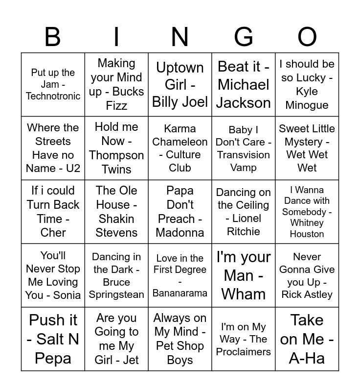 This bingo card has a free space and 44 words: Tainted Love - Soft Cell, Take on Me - A-Ha, A Little Respect - Erasure, Push it - Salt N Pepa, Hungary Like A Wolf - Duran Duran, I'm on My Way - The Proclaimers, Uptown Girl - Billy Joel, You got It - Roy Orbison, I should be so Lucky - Kyle Minogue, Are you Going to me My Girl - Jet, Beat it - Michael Jackson, Dancing on the Ceiling - Lionel Ritchie, Love in the First Degree - Bananarama, Dancing in the Dark - Bruce Springstean, You Spin Me Right Round - Dead or Alive, Always on My Mind - Pet Shop Boys, Goody Too Shoes - Adam Ant, If i could Turn Back Time - Cher, When will i be Famous - Bros, Sweet Little Mystery - Wet Wet Wet, Making your Mind up - Bucks Fizz, Don't Leave me This Way - The Communards, The only Way is Up - Yas, Put up the Jam - Technotronic, Leave the Light on - Belinda Carlisle, I Wanna Dance with Somebody - Whitney Houston, Radio Gaga - Queen, You Can't Hurry Love - Phill Collins, I'm your Man - Wham, You'll Never Stop Me Loving You - Sonia, Happy Hour - The House Martins, Never Gonna Give you Up - Rick Astley, I Think Were Alone Now - Tiffany, We Love Rock - DJ Seiyer, The Ole House - Shakin Stevens, Town Called Malice - The Jam, Perfect - Fairground Attraction, Don't you Want me - Human League, Karma Chameleon - Culture Club, Where the Streets Have no Name - U2, Baby I Don't Care - Transvision Vamp, Just Can't get Enough - Depeche Mode, Hold me Now - Thompson Twins and Requiem - London Boys.