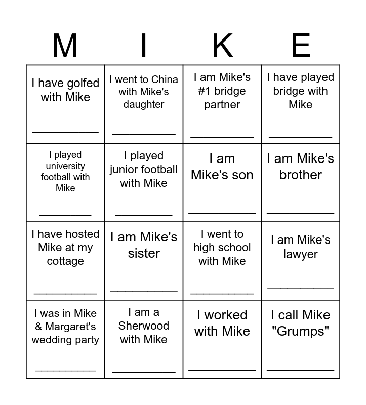 This bingo card has 16 words: I am a Sherwood with Mike __________, I am Mike's lawyer __________, I am Mike's #1 bridge partner __________, I have golfed with Mike __________, I have hosted Mike at my cottage __________, I went to China with Mike's daughter ___________, I went to high school with Mike __________, I worked with Mike _________, I played university football with Mike __________, I played junior football with Mike _________, I was in Mike & Margaret's wedding party __________, I have played bridge with Mike __________, I am Mike's sister _________, I am Mike's brother _________, I am Mike's son _________ and I call Mike "Grumps" _________.