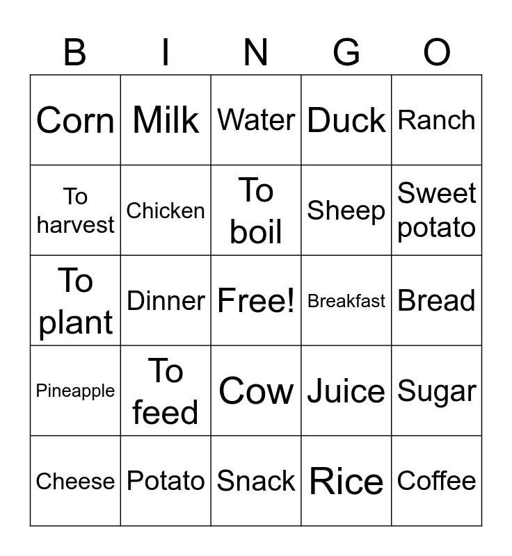 This bingo card has a free space and 29 words: Cheese, To eat, Dinner, Lunch, Corn, Water, Chicken, To feed, Breakfast, Potato, Bread, Coffee, Snack, Rice, Sweet potato, To drink, Cow, Pineapple, Ranch, To plant, Juice, Pig, Sheep, To harvest, Duck, Milk, Sugar, To boil and To cook.