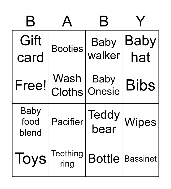This bingo card has 40 words: Swaddle Blanket, Teddy bear, Changing pad, Baby Onesie, Bath kit, Baby Lotion, Bibs, Burp Cloths, Free!, Bassinet, Wipes, Baby hat, Toys, Bottle, Teething ring, Baby food, Towels, Gift card, Memory journal, Baby walker, Toy box, Diapers, Baby food blend, Wash Cloths, Stroller, Baby monitor, Nursery Decor, Crib Sheets, Mobile, Baby socks, Baby book, Baby shampoo, Burp cloth, Picture frame, Pacifier, Stuffed Animal, Mittens, Sleep sack, Booties and Rattle.