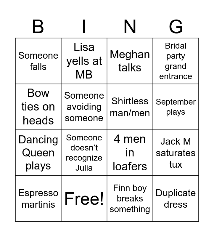 This bingo card has 21 words: Free!, Laura undermines friends clothes/accessories, Lisa yells at MB, Public meltdown, Finn boy breaks something, Shirtless man/men, Someone falls, Meghan talks, 4 men in loafers, September plays, Dancing Queen plays, Bridal party grand entrance, Duplicate dress, Weird color tuxedo, Someone avoiding someone, Shrimp cocktail, Espresso martinis, Someone doesn’t recognize Julia, Bow ties on heads, Jack M saturates tux and Jack M gets drinks celebratory dumped on him.
