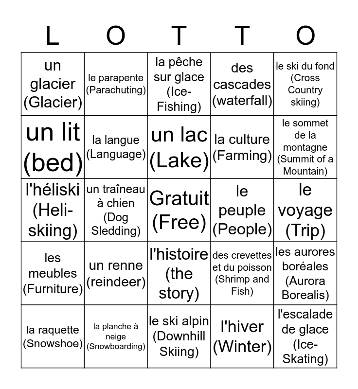 This bingo card has a free space and 24 words: un renne (reindeer), la planche à neige (Snowboarding), un lac (Lake), la raquette (Snowshoe), le ski du fond (Cross Country skiing), un glacier (Glacier), un lit (bed), le parapente (Parachuting), le peuple (People), l'histoire (the story), la culture (Farming), l'héliski (Heli-skiing), des crevettes et du poisson (Shrimp and Fish), les aurores boréales (Aurora Borealis), la langue (Language), l'hiver (Winter), le voyage (Trip), la pêche sur glace (Ice-Fishing), le sommet de la montagne (Summit of a Mountain), un traîneau à chien (Dog Sledding), l'escalade de glace (Ice-Skating), les meubles (Furniture), des cascades (waterfall) and le ski alpin (Downhill Skiing).