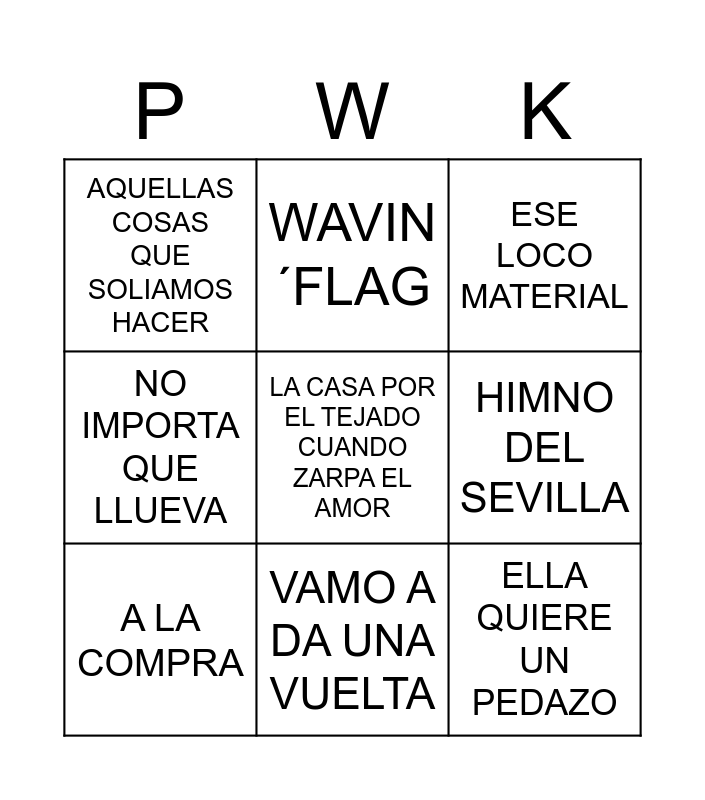This bingo card has 23 words: LA RUMBA DEL TARTAMUDO, LA ROJO BAILA, ELLA QUIERE UN PEDAZO, A TUNELADORA, VAMO A DA UNA VUELTA, ESE LOCO MATERIAL, AQUELLAS COSAS QUE SOLIAMOS HACER, WAVIN´FLAG, FLYING FREE, BARQUITO, DONDE ESTAN LAS GATAS, MATALAS, EL REY, QUE TE DEN 1+1 SON 7, BUSCATE UN HOMBRE QUE TE QUIERA, PA´ MADRID, LA CASA POR EL TEJADO CUANDO ZARPA EL AMOR, ORGULLO BARRIERO, NO IMPORTA QUE LLUEVA, EL CATAPÁN, HIMNO DEL SEVILLA, A LA COMPRA and LAS BAILAS.