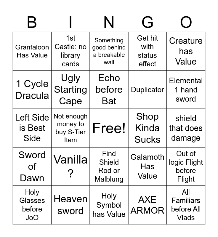 This bingo card has a free space and 24 words: Vanilla ?, Heaven sword, Echo before Bat, Holy Glasses before JoO, Creature has Value, Granfaloon Has Value, 1 Cycle Dracula, 1st Castle: no library cards, Shop Kinda Sucks, Find Shield Rod or Malblung, Duplicator, Left Side is Best Side, Galamoth Has Value, Out of logic Flight before Flight, Ugly Starting Cape, AXE ARMOR, shield that does damage, Something good behind a breakable wall, Elemental 1 hand sword, Not enough money to buy S-Tier Item, All Familiars before All Vlads, Sword of Dawn, Get hit with status effect and Holy Symbol has Value.