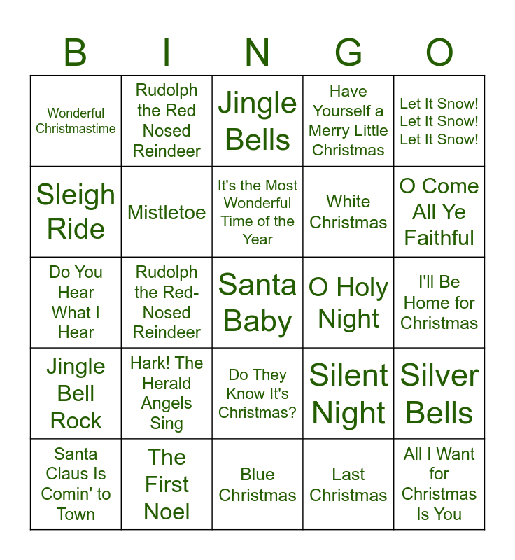 This bingo card has 34 words: All I Want for Christmas Is You, Last Christmas, Rockin' Around the Christmas Tree, It's Beginning to Look a Lot Like Christmas, Jingle Bell Rock, Mistletoe, Let It Snow! Let It Snow! Let It Snow!, Santa Claus Is Comin' to Town, Rudolph the Red Nosed Reindeer, Joy to the World, It's the Most Wonderful Time of the Year, Jingle Bells, Underneath the Tree, Deck the Halls, O Holy Night, O Come All Ye Faithful, The First Noel, Do You Hear What I Hear, Hark! The Herald Angels Sing, Silent Night, Do They Know It's Christmas?, Feliz Navidad, Wonderful Christmastime, I'll Be Home for Christmas, Blue Christmas, Santa Baby, Have Yourself a Merry Little Christmas, The Christmas Song, White Christmas, Sleigh Ride, Frosty the Snowman, Rudolph the Red-Nosed Reindeer, Silver Bells and I Saw Mommy Kissing Santa Claus.