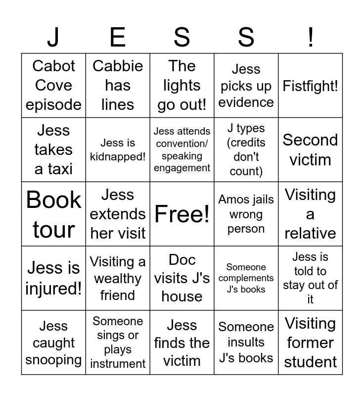 This bingo card has a free space and 24 words: Visiting a wealthy friend, Someone sings or plays instrument, Jess attends convention/ speaking engagement, Jess caught snooping, Fistfight!, Cabot Cove episode, Jess takes a taxi, Cabbie has lines, Amos jails wrong person, Doc visits J's house, J types (credits don't count), Book tour, Someone complements J's books, Jess is told to stay out of it, Jess is kidnapped!, Someone insults J's books, Visiting a relative, The lights go out!, Second victim, Jess extends her visit, Visiting former student, Jess is injured!, Jess picks up evidence and Jess finds the victim.