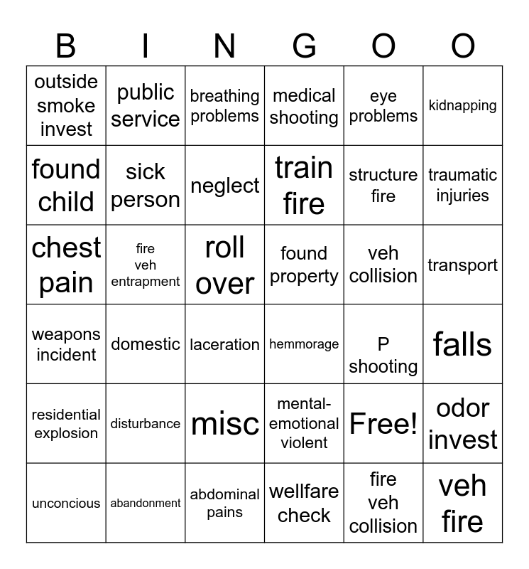 This bingo card has 36 words: mental-emotional violent, misc, wellfare check, found child, weapons incident, found property, sick person, abdominal pains, eye problems, Free!, traumatic injuries, medical shooting, odor invest, fire veh entrapment, train fire, outside smoke invest, residential explosion, veh collision, chest pain, breathing problems, roll over, domestic, hemmorage, laceration, P shooting, public service, structure fire, abandonment, neglect, kidnapping, veh fire, unconcious, falls, transport, disturbance and fire veh collision.