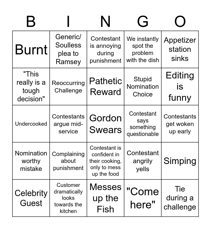 This bingo card has a free space and 24 words: Complaining about punishment, Customer dramatically looks towards the kitchen, Pathetic Reward, Celebrity Guest, Appetizer station sinks, Burnt, "This really is a tough decision", Generic/ Soulless plea to Ramsey, Contestant says something questionable, Contestant is confident in their cooking, only to mess up the food, Stupid Nomination Choice, Undercooked, Contestant angrily yells, Simping, Reoccurring Challenge, "Come here", Contestants get woken up early, Contestant is annoying during punishment, Editing is funny, Contestants argue mid-service, Tie during a challenge, Nomination worthy mistake, We instantly spot the problem with the dish and Messes up the Fish.