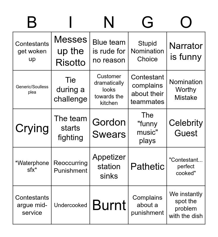 This bingo card has a free space and 24 words: Reoccurring Punishment, Undercooked, Customer dramatically looks towards the kitchen, Contestants argue mid-service, Narrator is funny, Contestants get woken up, Generic/Soulless plea, Messes up the Risotto, The "funny music" plays, Appetizer station sinks, Contestant complains about their teammates, Crying, Pathetic, "Contestant... perfect cooked", Tie during a challenge, Complains about a punishment, Celebrity Guest, Blue team is rude for no reason, Nomination Worthy Mistake, The team starts fighting, We instantly spot the problem with the dish, *Waterphone sfx*, Stupid Nomination Choice and Burnt.