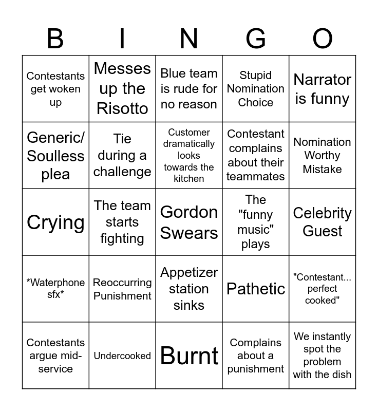 This bingo card has a free space and 24 words: Reoccurring Punishment, Undercooked, Customer dramatically looks towards the kitchen, Contestants argue mid-service, Narrator is funny, Contestants get woken up, Generic/ Soulless plea, Messes up the Risotto, The "funny music" plays, Appetizer station sinks, Contestant complains about their teammates, Crying, Pathetic, "Contestant... perfect cooked", Tie during a challenge, Complains about a punishment, Celebrity Guest, Blue team is rude for no reason, Nomination Worthy Mistake, The team starts fighting, We instantly spot the problem with the dish, *Waterphone sfx*, Stupid Nomination Choice and Burnt.