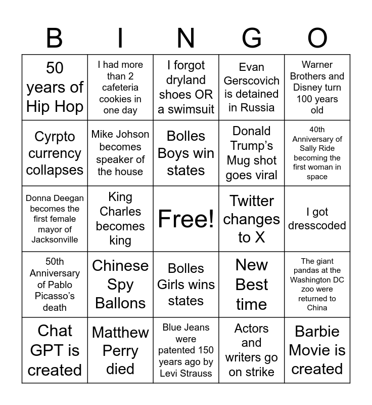 This bingo card has a free space and 39 words: Chiefs win the Super Bowl, Taylor Swift’s Eras Tour, Scottie Scheffler wins TPC, Mike Johson becomes speaker of the house, Chat GPT is created, Bolles Girls wins states, Bolles Boys win states, Rihanna performs the Super Bowl Halftime Show, Warner Brothers and Disney turn 100 years old, 50th Anniversary of Pablo Picasso’s death, King Charles becomes king, Evan Gerscovich is detained in Russia, Barbie Movie is created, I got dresscoded, Twitter changes to X, Chinese Spy Ballons, Jimmy Buffet died, 50 years of Hip Hop, Ozempic is approved by FDA, New Best time, Cyrpto currency collapses, Blue Jeans were patented 150 years ago by Levi Strauss, Donald Trump’s Mug shot goes viral, 40th Anniversary of Sally Ride becoming the first woman in space, I took the SAT, I failed a test, I scored a 100%, I got a parking warning, I skipped a class, I had more than 2 cafeteria cookies in one day, I posted on 2x on Instagram this year, I bought new lulu shorts, I forgot dryland shoes OR a swimsuit, Matthew Perry died, Actors and writers go on strike, I ate at the LOOP, The giant pandas at the Washington DC zoo were returned to China, Donna Deegan becomes the first female mayor of Jacksonville and Word of the Year was Rizz.