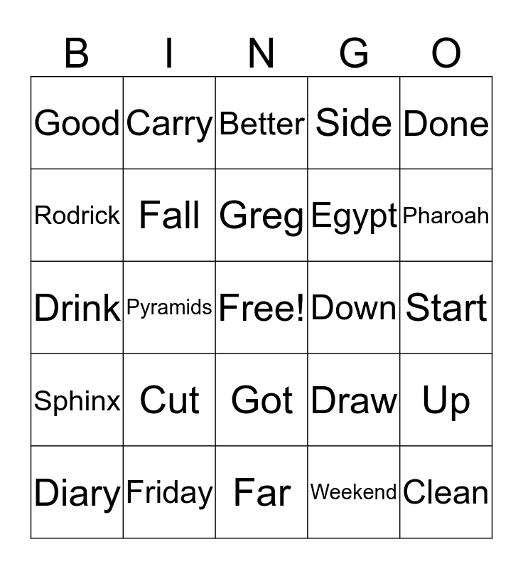 This bingo card has a free space and 24 words: Cut, Friday, Greg, Diary, Done, Good, Rodrick, Carry, Down, Got, Egypt, Drink, Draw, Up, Fall, Weekend, Start, Better, Pharoah, Pyramids, Clean, Sphinx, Side and Far.