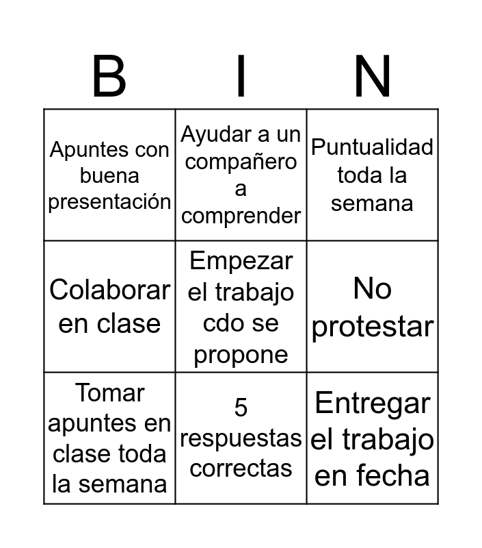 This bingo card has 9 words: Tomar apuntes en clase toda la semana, Puntualidad toda la semana, Ayudar a un compañero a comprender, Colaborar en clase, Apuntes con buena presentación, No protestar, Empezar el trabajo cdo se propone, Entregar el trabajo en fecha and 5 respuestas correctas.
