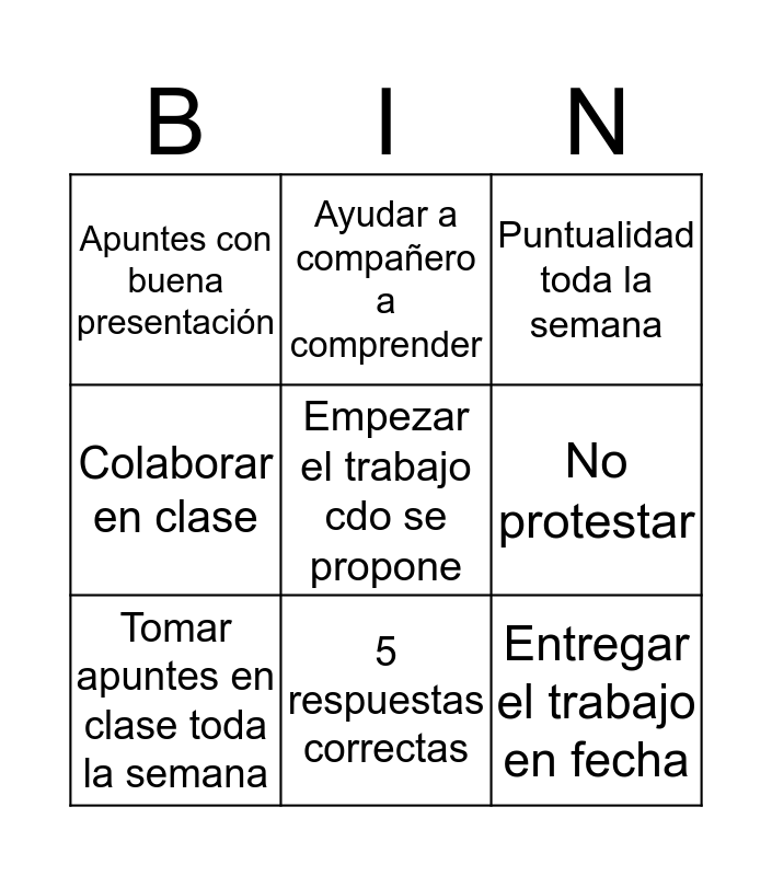 This bingo card has 9 words: Tomar apuntes en clase toda la semana, Puntualidad toda la semana, Ayudar a compañero a comprender, Colaborar en clase, Apuntes con buena presentación, No protestar, Empezar el trabajo cdo se propone, Entregar el trabajo en fecha and 5 respuestas correctas.