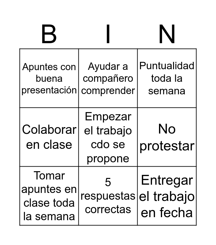 This bingo card has 9 words: Tomar apuntes en clase toda la semana, Puntualidad toda la semana, Ayudar a compañero comprender, Colaborar en clase, Apuntes con buena presentación, No protestar, Empezar el trabajo cdo se propone, Entregar el trabajo en fecha and 5 respuestas correctas.