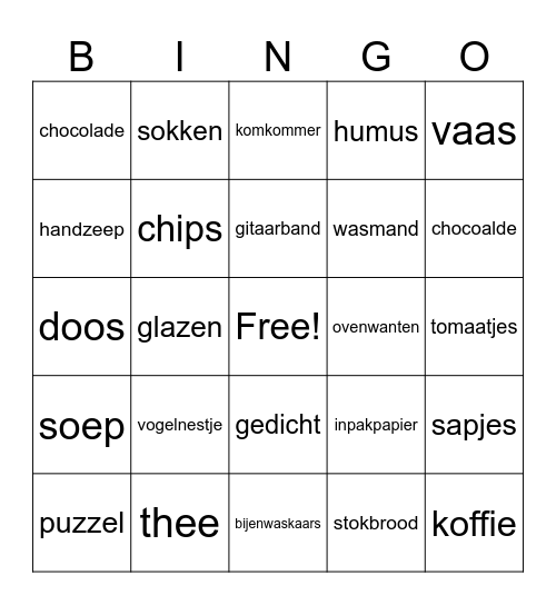 This bingo card has a free space and 25 words: vogelnestje, bijenwaskaars, gitaarband, puzzel, vaas, chocolade, handzeep, sokken, ovenwanten, gedicht, wasmand, doos, inpakpapier, sapjes, chips, zoutjes, tomaatjes, komkommer, chocoalde, glazen, koffie, thee, soep, humus and stokbrood.