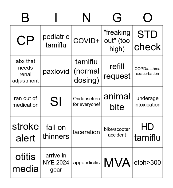 This bingo card has a free space and 29 words: otitis media, OD given Narcan, SI, abdominal pain, CP, COVID+, paxlovid, fall on thinners, animal bite, arrive in NYE 2024 gear, underage intoxication, etoh>300, appendicitis, MVA, COPD/asthma exacerbation, GSW, laceration, stroke alert, STD check, ran out of medication, bike/scooter accident, foreign body in (any) orifice, refill request, abx that needs renal adjustment, "freaking out" (too high), pediatric tamiflu, HD tamiflu, tamiflu (normal dosing) and broken bone.
