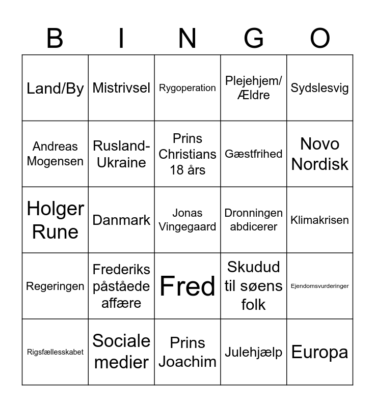 This bingo card has a free space and 39 words: Royal Run, Håndbolddamerne, Israel-Palæstina, Rusland-Ukraine, Rigsfællesskabet, Fred, Prins Christians 18 års, Plejebørn, Sydslesvig, Regeringen, Danmark, Plejehjem/Ældre, Europa, Klimakrisen, Dronningen abdicerer, Frederiks påståede affære, Titelkrise, Land/By, Kunstig intelligens, Skudud til søens folk, Andreas Mogensen, Prins Joachim, Gæstfrihed, Novo Nordisk, USA, Menneskerettigheder, Dannebrog, Ytringsfrihed, Koranafbrændinger, Mistrivsel, Sygeplejersker, Nedbør/Regn, Rygoperation, Sociale medier, Julehjælp, Inflation, Ejendomsvurderinger, Holger Rune and Store bededag.
