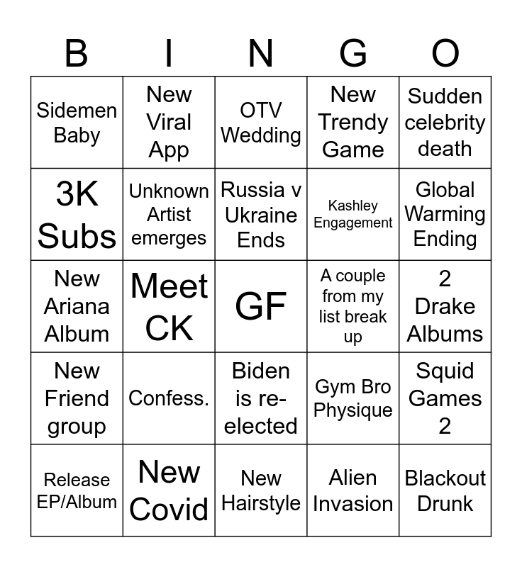 This bingo card has a free space and 24 words: Confess., New Covid, Russia v Ukraine Ends, Release EP/Album, Sudden celebrity death, Sidemen Baby, 3K Subs, New Viral App, A couple from my list break up, Biden is re-elected, Kashley Engagement, New Ariana Album, Gym Bro Physique, Squid Games 2, Unknown Artist emerges, Alien Invasion, 2 Drake Albums, OTV Wedding, Global Warming Ending, Meet CK, Blackout Drunk, New Friend group, New Trendy Game and New Hairstyle.