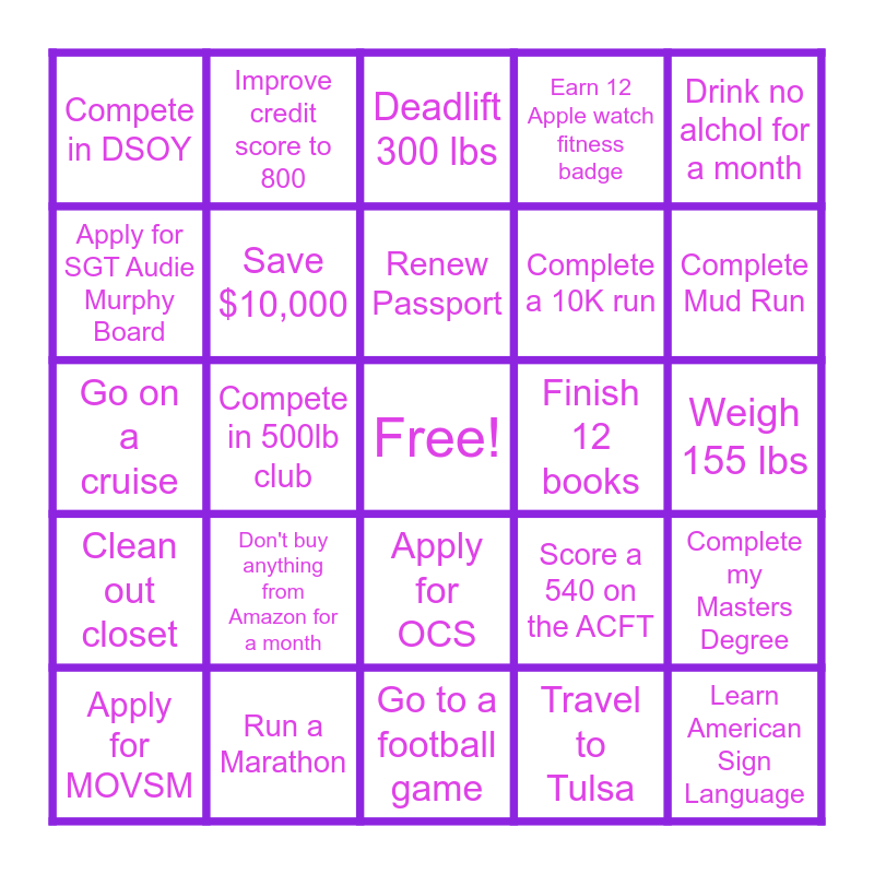 This bingo card has a free space and 24 words: Don't buy anything from Amazon for a month, Run a Marathon, Renew Passport, Apply for MOVSM, Drink no alchol for a month, Compete in DSOY, Apply for SGT Audie Murphy Board, Improve credit score to 800, Finish 12 books, Apply for OCS, Complete a 10K run, Go on a cruise, Score a 540 on the ACFT, Complete my Masters Degree, Save $10,000, Travel to Tulsa, Weigh 155 lbs, Deadlift 300 lbs, Complete Mud Run, Compete in 500lb club, Learn American Sign Language, Clean out closet, Earn 12 Apple watch fitness badge and Go to a football game.