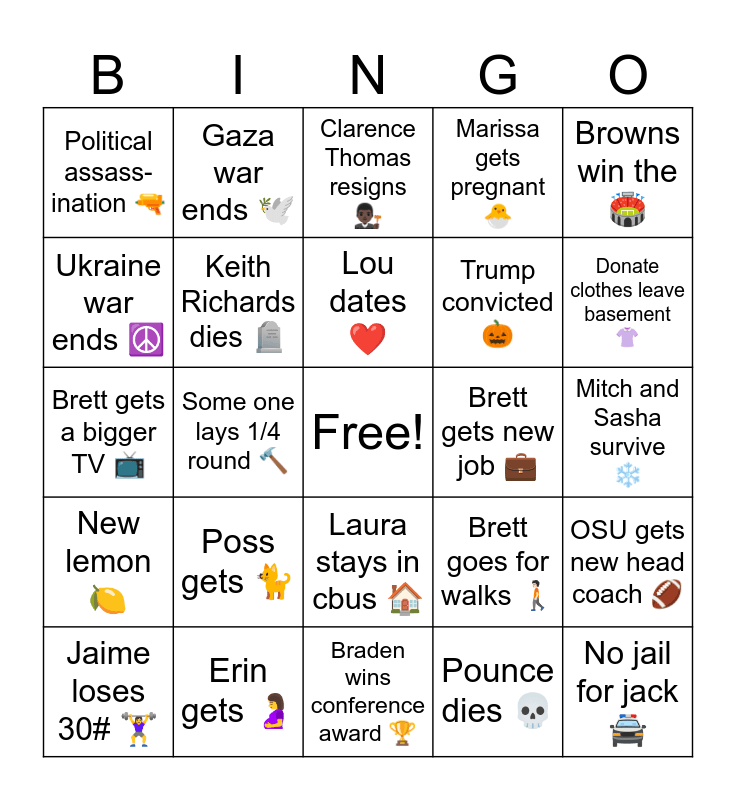 This bingo card has a free space and 24 words: Poss gets ð, Erin gets ðΰ, Lou dates âĪïļ, Jaime loses 30# ðïļââïļ, Browns win the ðïļ, Political assass-ination ðŦ, Ukraine war ends âŪïļ, Gaza war ends ðïļ, Brett gets new job ðž, Laura stays in cbus ð , Trump convicted ð, Brett gets a bigger TV ðš, Brett goes for walks ðķðŧ, OSU gets new head coach ð, Keith Richards dies ðŠĶ, Pounce dies ð, Mitch and Sasha survive âïļ, Clarence Thomas resigns ðĻðŋââïļ, Donate clothes leave basement ð, Some one lays 1/4 round ðĻ, No jail for jack ð, New lemon ð, Marissa gets pregnant ðĢ and Braden wins conference award ð.
