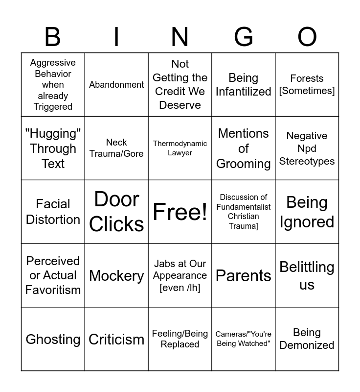 This bingo card has a free space and 24 words: Mockery, Criticism, Thermodynamic Lawyer, Ghosting, Forests [Sometimes], Aggressive Behavior when already Triggered, "Hugging" Through Text, Abandonment, Discussion of Fundamentalist Christian Trauma], Jabs at Our Appearance [even /lh], Mentions of Grooming, Facial Distortion, Parents, Belittling us, Neck Trauma/Gore, Cameras/"You're Being Watched", Being Ignored, Not Getting the Credit We Deserve, Negative Npd Stereotypes, Door Clicks, Being Demonized, Perceived or Actual Favoritism, Being Infantilized and Feeling/Being Replaced.