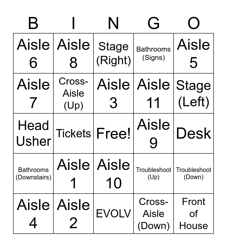 This bingo card has a free space and 24 words: Aisle 1, Aisle 2, Aisle 3, Aisle 4, Aisle 5, Aisle 6, Aisle 7, Aisle 8, Aisle 9, Aisle 10, Aisle 11, Head Usher, Troubleshoot (Up), Troubleshoot (Down), Cross-Aisle (Up), Cross-Aisle (Down), Desk, Stage (Right), Stage (Left), Tickets, Front of House, Bathrooms (Downstairs), Bathrooms (Signs) and EVOLV.