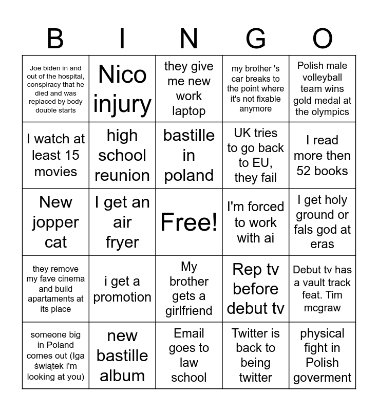 This bingo card has a free space and 24 words: i get a promotion, new bastille album, bastille in poland, someone big in Poland comes out (Iga świątek i'm looking at you), Polish male volleyball team wins gold medal at the olympics, Joe biden in and out of the hospital, conspiracy that he died and was replaced by body double starts, I watch at least 15 movies, Nico injury, I'm forced to work with ai, My brother gets a girlfriend, UK tries to go back to EU, they fail, New jopper cat, Rep tv before debut tv, Debut tv has a vault track feat. Tim mcgraw, high school reunion, Twitter is back to being twitter, I get holy ground or fals god at eras, they give me new work laptop, I read more then 52 books, I get an air fryer, physical fight in Polish goverment, they remove my fave cinema and build apartaments at its place, my brother 's car breaks to the point where it's not fixable anymore and Email goes to law school.