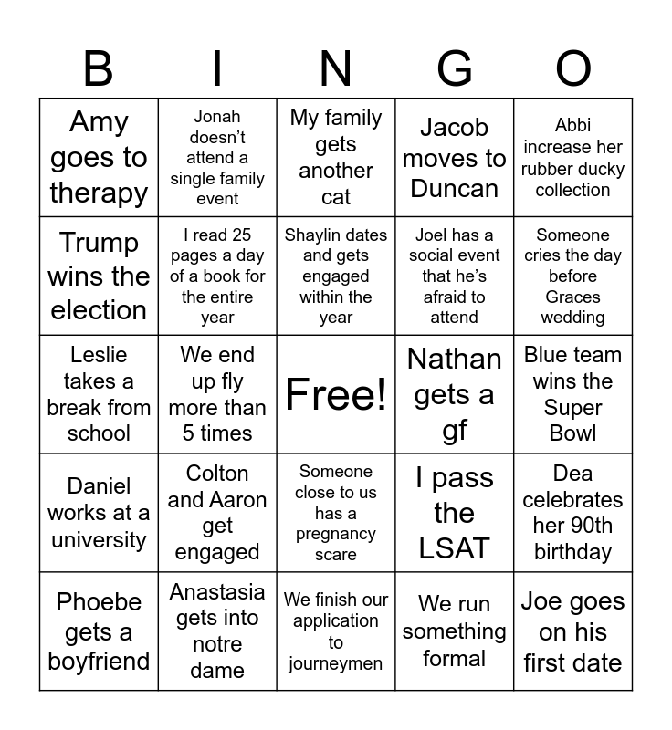 This bingo card has a free space and 24 words: Phoebe gets a boyfriend, Colton and Aaron get engaged, Shaylin dates and gets engaged within the year, We run something formal, Abbi increase her rubber ducky collection, Amy goes to therapy, Jonah doesn’t attend a single family event, My family gets another cat, Nathan gets a gf, Blue team wins the Super Bowl, Leslie takes a break from school, I read 25 pages a day of a book for the entire year, I pass the LSAT, Dea celebrates her 90th birthday, Trump wins the election, Anastasia gets into notre dame, We finish our application to journeymen, Jacob moves to Duncan, Someone cries the day before Graces wedding, Daniel works at a university, We end up fly more than 5 times, Someone close to us has a pregnancy scare, Joel has a social event that he’s afraid to attend and Joe goes on his first date.