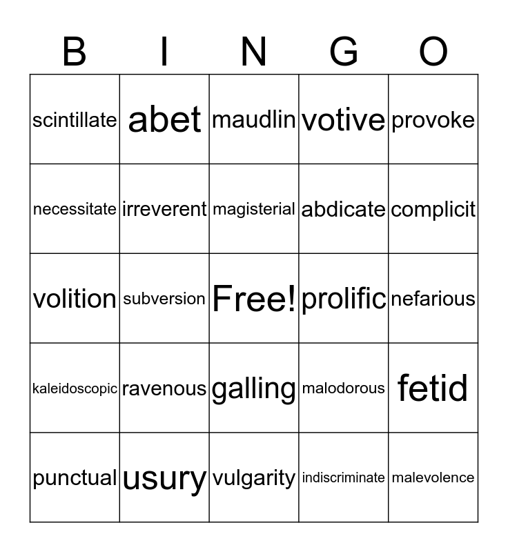 This bingo card has a free space and 25 words: ravenous, vulgarity, magisterial, punctual, provoke, scintillate, necessitate, abet, prolific, galling, abdicate, volition, malodorous, fetid, irreverent, keen, nefarious, maudlin, complicit, subversion, malevolence, usury, kaleidoscopic, votive and indiscriminate.