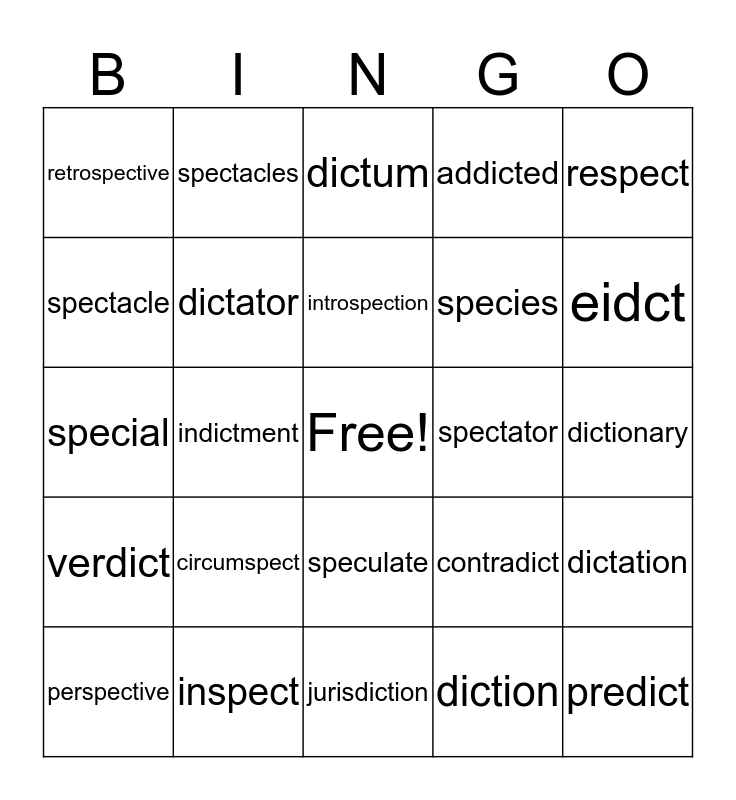 This bingo card has a free space and 24 words: circumspect, inspect, introspection, perspective, respect, retrospective, spectacle, spectacles, spectator, speculate, species, special, contradict, dictation, dictator, diction, dictionary, dictum, eidct, indictment, predict, verdict, addicted and jurisdiction.