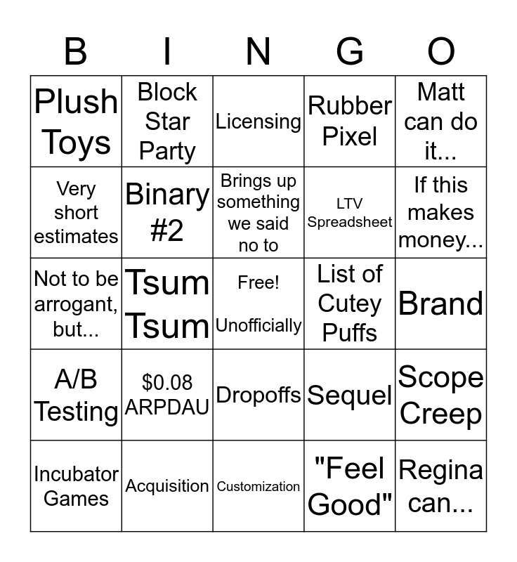 This bingo card has a free space and 24 words: $0.08 ARPDAU, Acquisition, Brings up something we said no to, Incubator Games, Matt can do it..., Plush Toys, Very short estimates, Block Star Party, List of Cutey Puffs, Dropoffs, LTV Spreadsheet, Not to be arrogant, but..., Sequel, Scope Creep, Binary #2, "Feel Good", Brand, Licensing, If this makes money..., Tsum Tsum, Regina can..., A/B Testing, Rubber Pixel and Customization.