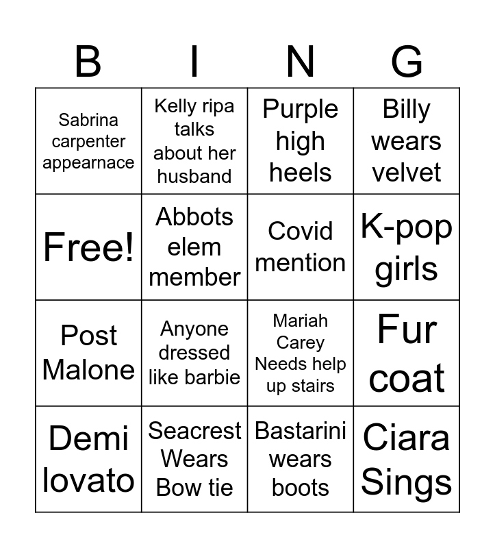 This bingo card has 16 words: Seacrest Wears Bow tie, Fur coat, Purple high heels, Sabrina carpenter appearnace, Post Malone, Kelly ripa talks about her husband, Mariah Carey Needs help up stairs, Bastarini wears boots, Free!, Abbots elem member, Demi lovato, Billy wears velvet, Anyone dressed like barbie, K-pop girls, Covid mention and Ciara Sings.