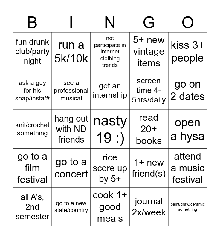 This bingo card has a free space and 24 words: go to a concert, go to a new state/country, get an internship, all A's, 2nd semester, kiss 3+ people, fun drunk club/party night, ask a guy for his snap/insta/#, run a 5k/10k, read 20+ books, rice score up by 5+, screen time 4-5hrs/daily, knit/crochet something, 1+ new friend(s), attend a music festival, see a professional musical, journal 2x/week, open a hysa, not participate in internet clothing trends, go on 2 dates, hang out with ND friends, paint/draw/ceramic something, go to a film festival, 5+ new vintage items and cook 1+ good meals.