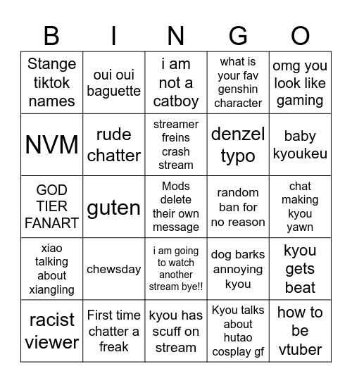 This bingo card has a free space and 24 words: chewsday, First time chatter a freak, streamer freins crash stream, racist viewer, omg you look like gaming, Stange tiktok names, NVM, oui oui baguette, random ban for no reason, i am going to watch another stream bye!!, denzel typo, GOD TIER FANART, dog barks annoying kyou, kyou gets beat, rude chatter, Kyou talks about hutao cosplay gf, chat making kyou yawn, i am not a catboy, baby kyoukeu, guten, how to be vtuber, xiao talking about xiangling, what is your fav genshin character and kyou has scuff on stream.