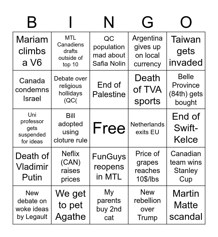 This bingo card has a free space and 24 words: Neflix (CAN) raises prices, We get to pet Agathe, End of Palestine, New debate on woke ideas by Legault, Taiwan gets invaded, Mariam climbs a V6, Canada condemns Israel, MTL Canadiens drafts outside of top 10, Netherlands exits EU, FunGuys reopens in MTL, Death of TVA sports, Uni professor gets suspended for ideas, Price of grapes reaches 10$/lbs, Canadian team wins Stanley Cup, Debate over religious hollidays (QC(, New rebellion over Trump, End of Swift-Kelce, QC population mad about Safia Nolin, Belle Province (84th) gets bought, Bill adopted using cloture rule, Martin Matte scandal, Death of Vladimir Putin, Argentina gives up on local currency and My parents buy 2nd cat.