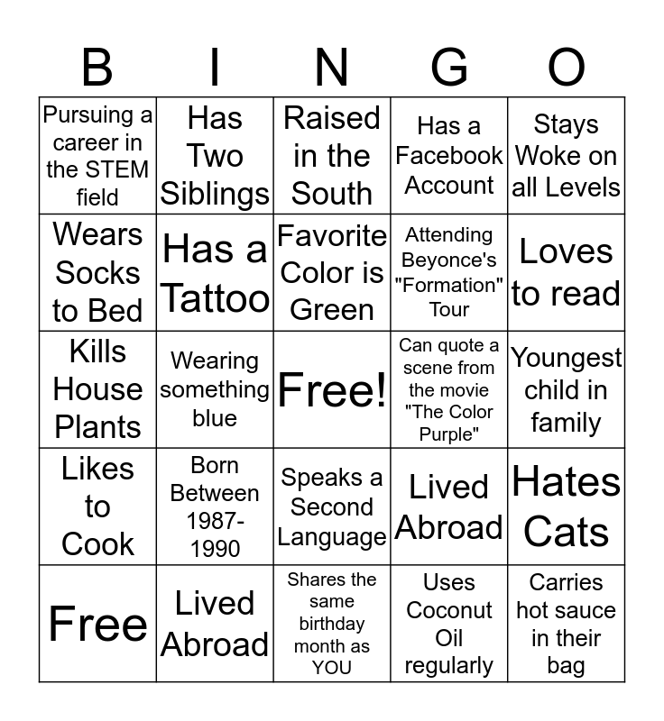This bingo card has a free space and 24 words: Born Between 1987-1990, Lived Abroad, Favorite Color is Green, Free, Stays Woke on all Levels, Pursuing a career in the STEM field, Wears Socks to Bed, Has Two Siblings, Can quote a scene from the movie "The Color Purple", Speaks a Second Language, Attending Beyonce's "Formation" Tour, Kills House Plants, Lived Abroad, Hates Cats, Has a Tattoo, Uses Coconut Oil regularly, Youngest child in family, Raised in the South, Loves to read, Wearing something blue, Carries hot sauce in their bag, Likes to Cook, Has a Facebook Account and Shares the same birthday month as YOU.