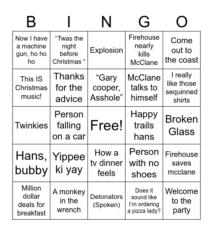 This bingo card has a free space and 24 words: Yippee ki yay, A monkey in the wrench, “Gary cooper, Asshole”, Million dollar deals for breakfast, Come out to the coast, Now I have a machine gun, ho ho ho, This IS Christmas music!, ‘‘Twas the night before Christmas “, Happy trails hans, How a tv dinner feels, McClane talks to himself, Twinkies, Person with no shoes, Firehouse saves mcclane, Thanks for the advice, Does it sound like I’m ordering a pizza lady?, Broken Glass, Explosion, I really like those sequinned shirts, Person falling on a car, Welcome to the party, Hans, bubby, Firehouse nearly kills McClane and Detonators (Spoken).