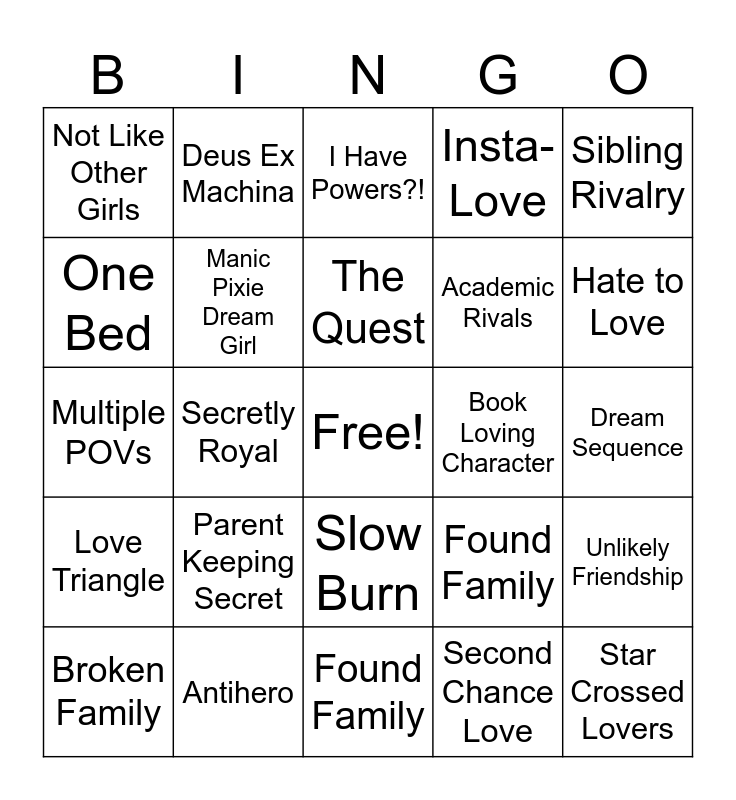 This bingo card has a free space and 36 words: The Golden Trio, The Chosen One, Time Travel, Manic Pixie Dream Girl, Found Family, Love Triangle, The Quest, Absent Parents, Sibling Rivalry, Magic School, Secretly Royal, Insta-Love, Friends to Lovers, Book Loving Character, Hate to Love, Not Like Other Girls, Bad Boy with Tragic Backstory, Parent Keeping Secret, Star Crossed Lovers, I Have Powers?!, Dream Sequence, Unlikely Friendship, Antihero, Broken Family, Found Family, Deus Ex Machina, Multiple POVs, Major Character Death, Academic Rivals, One Bed, Fake Dating, Grumpy x Sunshine, Second Chance Love, Slow Burn, Forced Proximity and Classical Retelling.